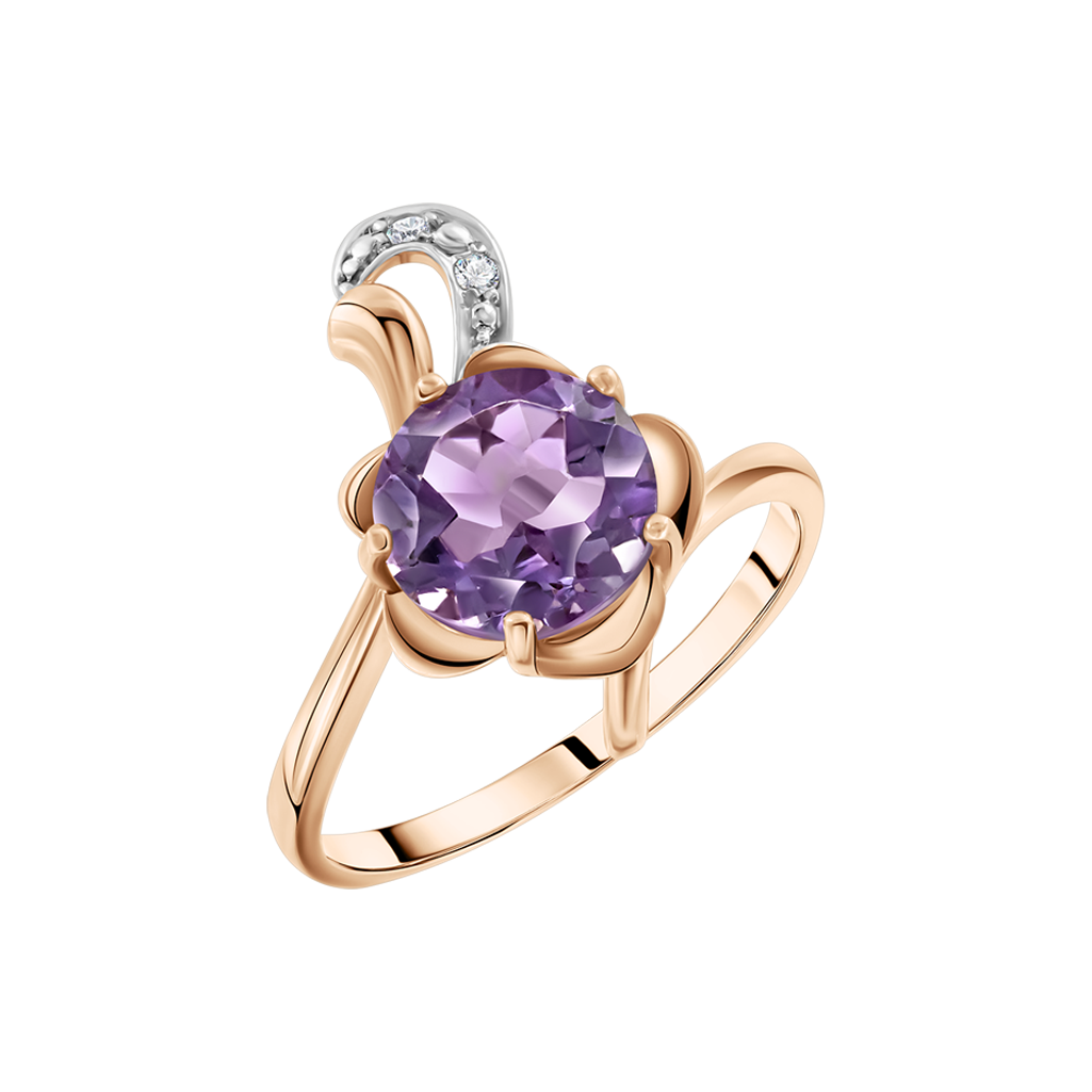 Великолепное женское кольцо из красного золото 585 пробы, со вставками из аметиста и фианитов. Кольцо притягивает взгляд своим женственным дизайном и вставками ярких камней. Аметист в круглой огранке очаровывает своим цветом и блеском на свету. Каст под аметистом в виде чаши цветка придает выразительности камню. Оригинальная форма ранта и шинки кольца, придают кольцу притягательный вид. Аметист - считается камнем, способный зародить любовь. Если преподнести украшение с камнем любимому человеку, то вскоре он (она) ответит человеку взаимностью. Зародив истинную любовь, талисман будет питать ее вечно, поэтому камень именуют хранителем вечной любви. Это украшение является прекрасным дополнением к вечернему и повседневному образу.