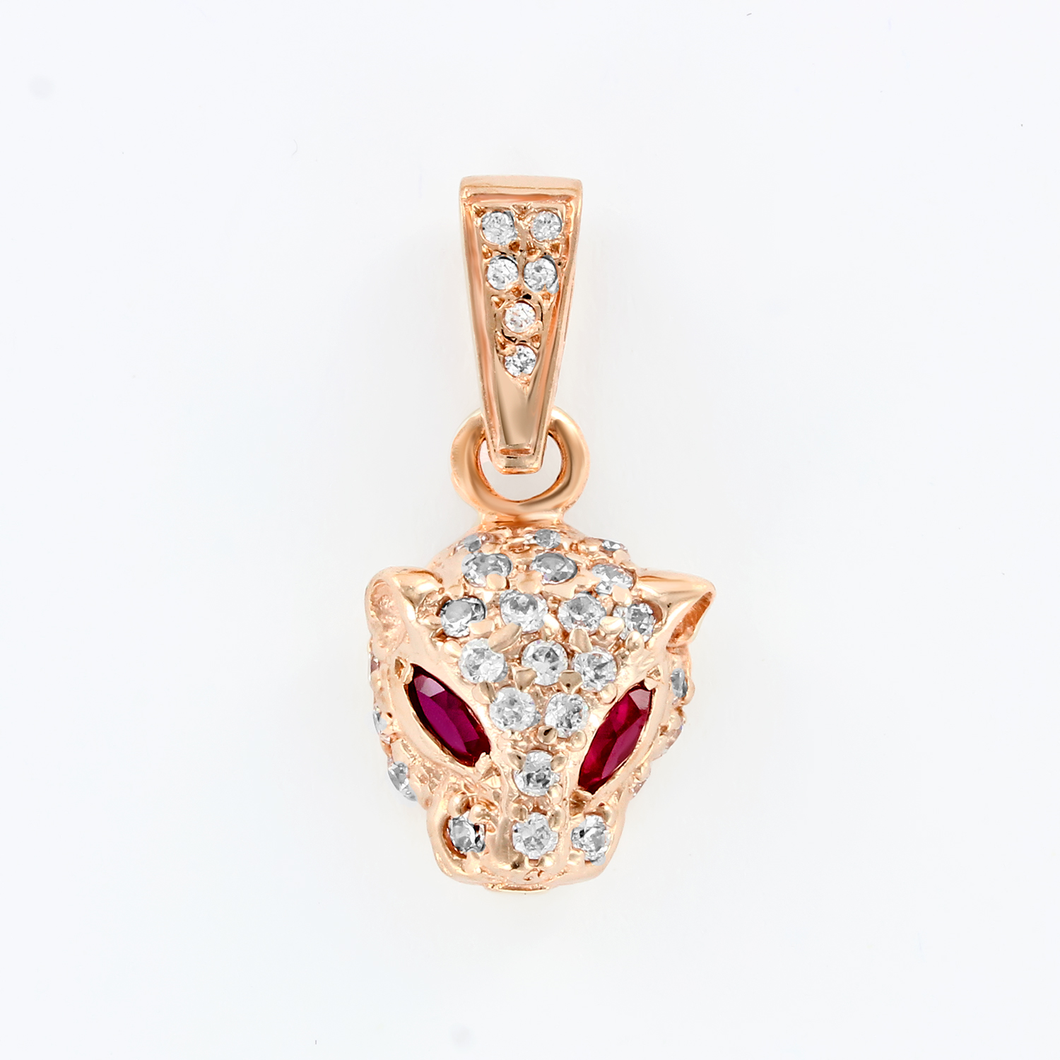 Подвеска из красного золота 585 в форме головы пантеры, украшенная фианитами и выразительными вставками насыщенного рубинового оттенка в виде глаз. Эффектный символ силы, уверенности и индивидуальности.