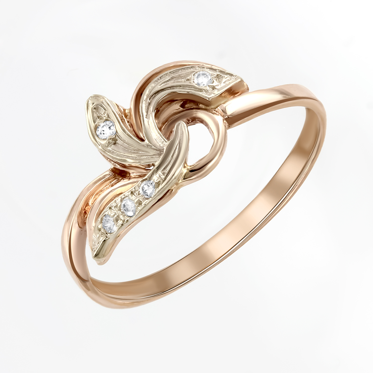 Изящное кольцо из красного золота 585 с переплетающимся орнаментом, украшенным сверкающими фианитами.