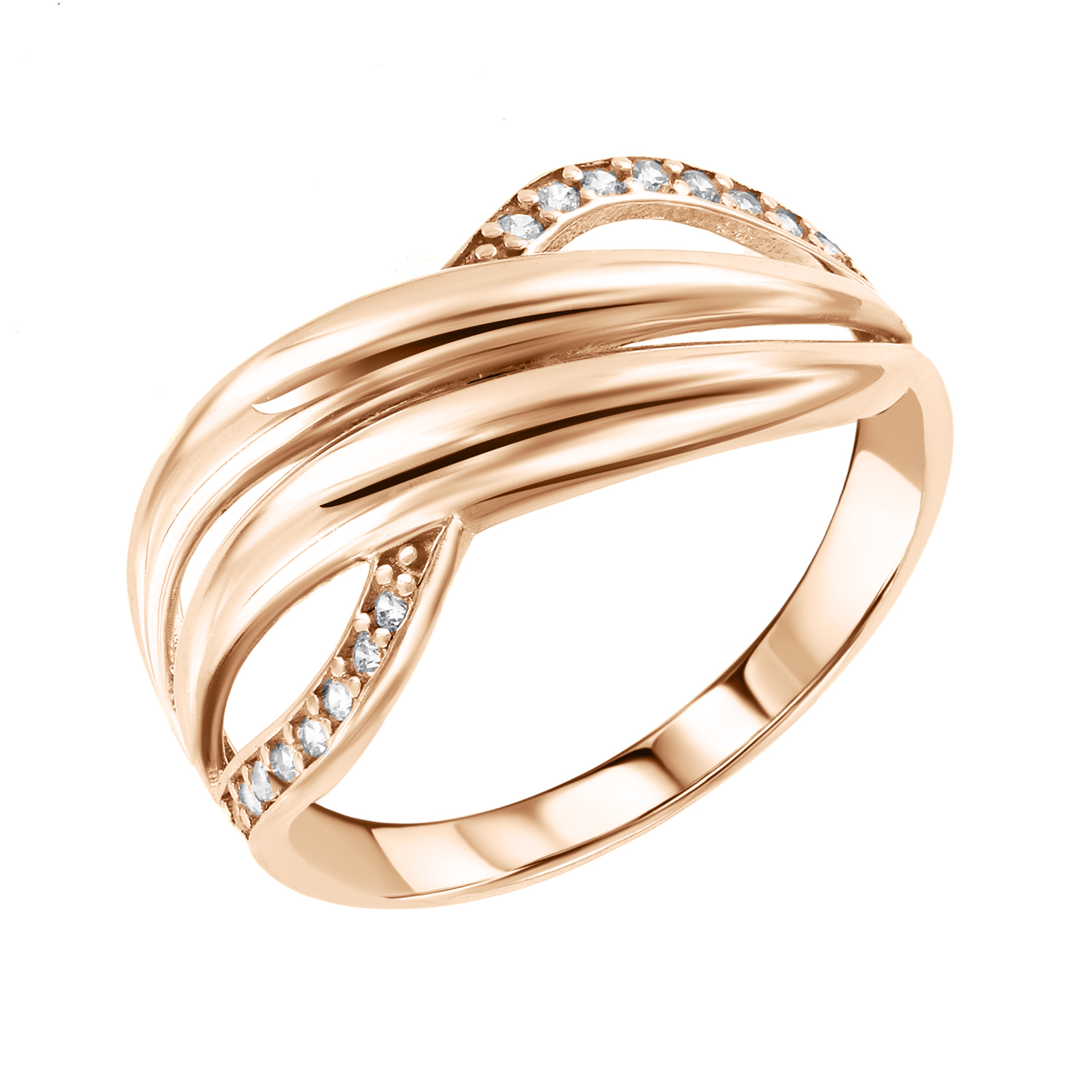 Стильное кольцо из красного золота 585 с изящными волнообразными линиями и сияющими фианитами.