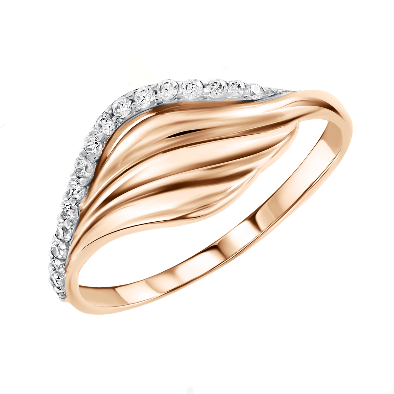 Изысканное кольцо из красного золота 585 с плавными рельефными линиями и дорожкой сияющих фианитов.
