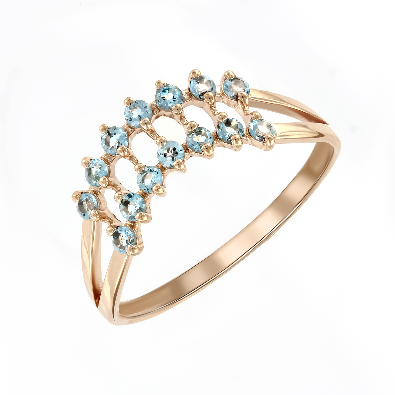 *** Если вы заказываете кольца размером больше 19,5 мм или меньше 16 мм, свяжитесь с нами по телефону. Изящное кольцо из красного золота 585 с небесно-голубыми топазами. Камни образуют воздушный ажурный узор, создающий эффект лёгкости и сияния. Тонкие линии оправы подчёркивают нежный блеск топазов и придают украшению романтичный, утончённый характер. Прекрасный выбор для повседневного образа и особых моментов.