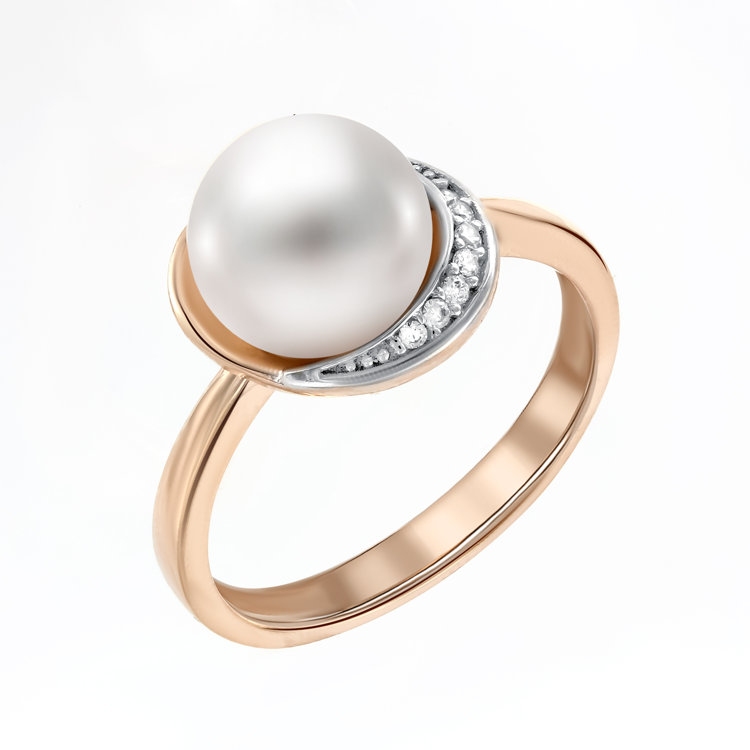 Элегантное кольцо из красного золота 585 с жемчугом, украшенным изящной дорожкой сияющих фианитов.