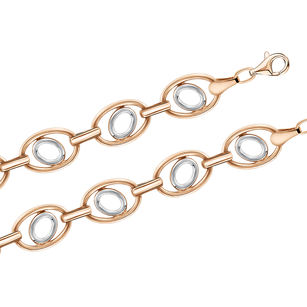 Изысканный браслет из русского красного и белого золота 585 пробы очаровывает плавным ритмом овальных звеньев и мягким контрастом оттенков металла.