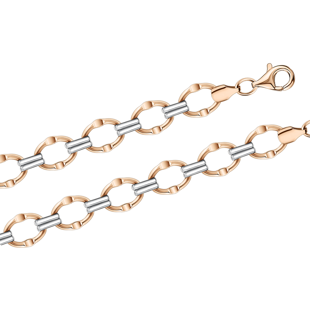 Элегантный браслет из русского красного и белого золота 585 пробы впечатляет сочетанием округлых и продолговатых звеньев.