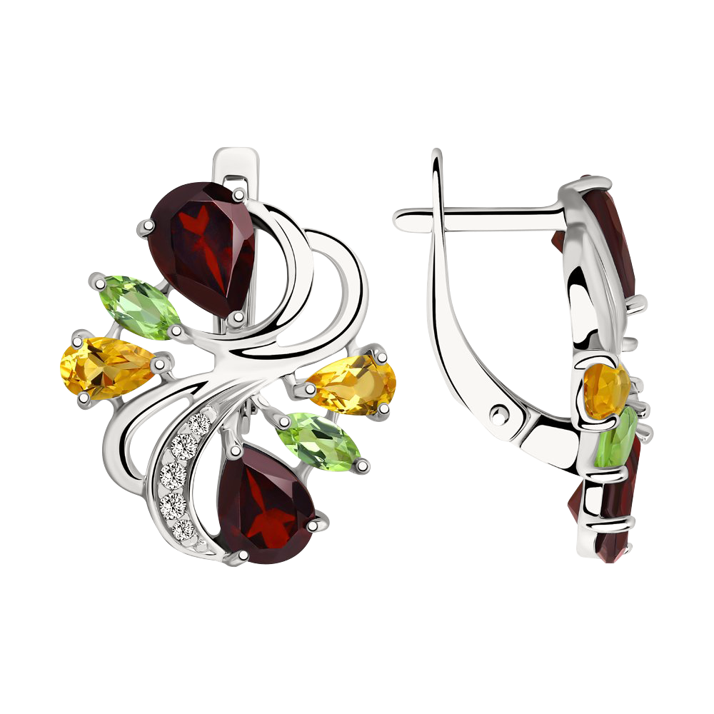 Красивые серьги из серебра 925 пробы, с вставками по 2 граната, 2 зеленых хризолита, 2 желтых цитрина и 5 бесцветных фианитов на каждой, английский замок, ширина ≈ 18 мм, высота изделия ≈ 21 мм. Вставка с миксом камней придали украшению особую нежность и притягательность. Яркие цвета привносят особый шарм в украшениях. Невероятно яркое и изысканное украшение. Украшение будет уместно как в праздничных, так и в более сдержанных повседневных образах. К серьгам есть кольцо. Почувствуйте себя нежной и женственной вместе с такими очаровательными украшениями.