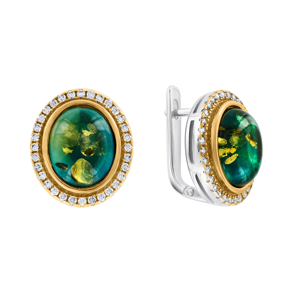 Тёплый природный оттенок янтаря красиво подчёркивается сиянием фианитов, создавая изысканный и женственный образ.